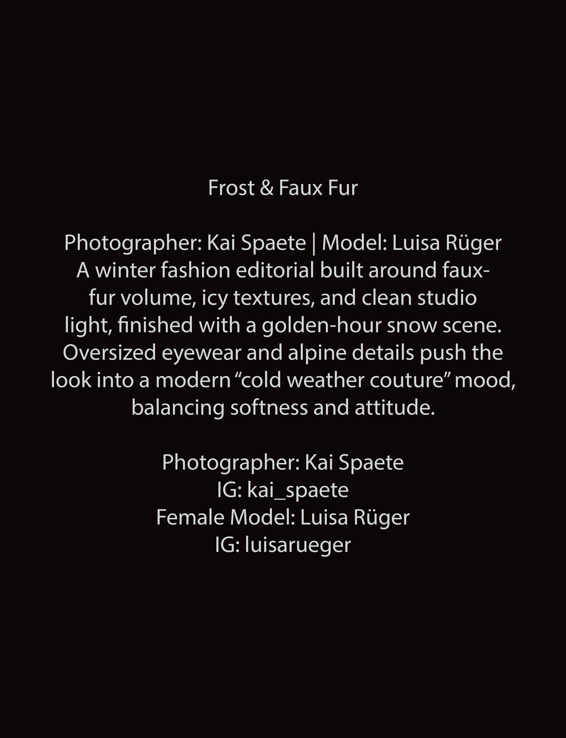Ich bin spezialisiert auf Fashion & Beauty Fotografie mit einem starken Fokus auf Editorial- und Magazin-Qualität. Diese Seite zeigt ausgewählte Shootings, kreative Kooperationen und Projekte, die in internationalen Kontexten entstanden sind. Mein Anspruch ist ein visueller Stil, der ästhetisch klar, technisch präzise und für redaktionelle Nutzung oder Markenkommunikation perfekt geeignet ist.